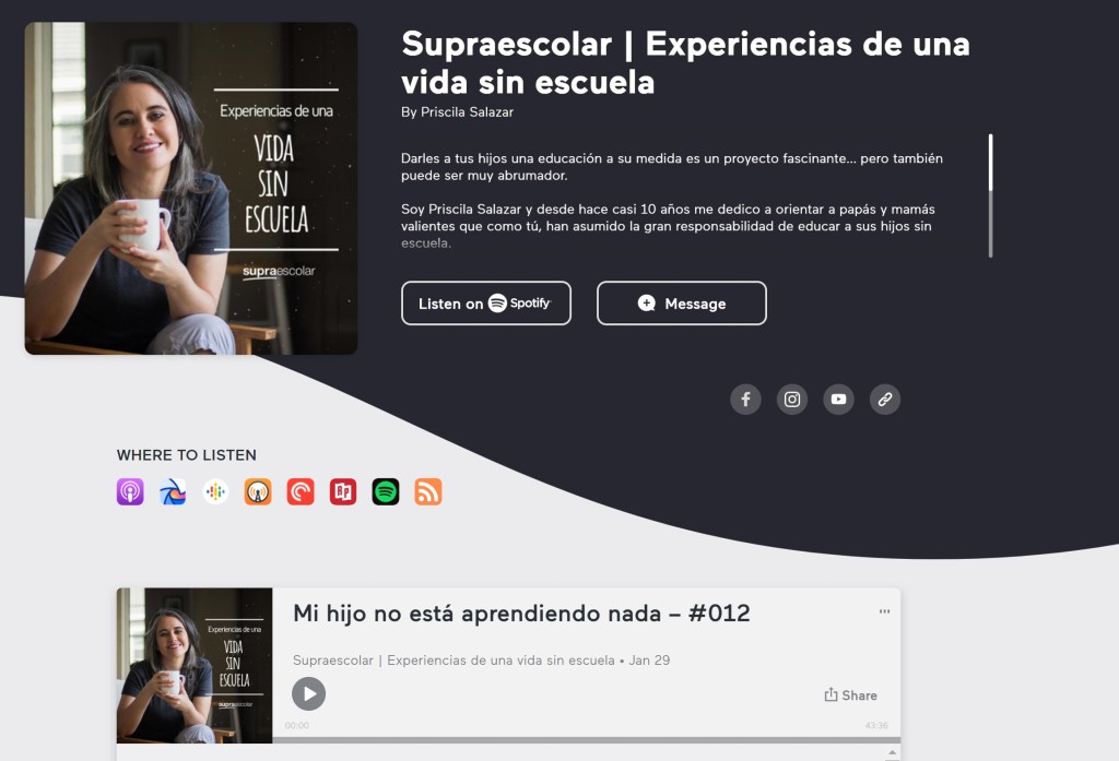 SupraEscolar: Experiencias de una vida sin escuela Priscila Salazar is a mom, writer and a leader in the field of “unschooling”. Her podcast speaks directly to my life right now, and it does so in beautifully articulated, crystal clear Spanish. Priscila covers topics specific to educating children outside of the traditional school system (which we happen to be doing right now), as well as issues like mom guilt, feelings of not doing enough, and rewards vs. punishment. I appreciate her candor and have found her insights to be truly helpful and informative.